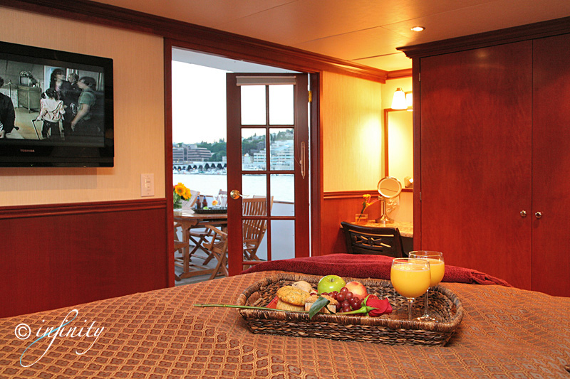 Bed. Private ensuite small bathroom with tub/shower. TV/DVD. Stateroom