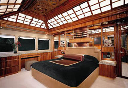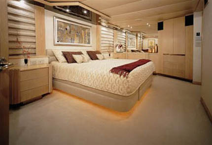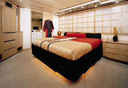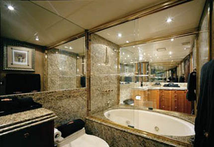 Master Stateroom on the Main Deck features a centerline king size bed, full entertainment center with flat screen TV/DVD, and settee. En-suite his and her bathrooms with marble countertops are separated by a large jacuzzi tub with shower.